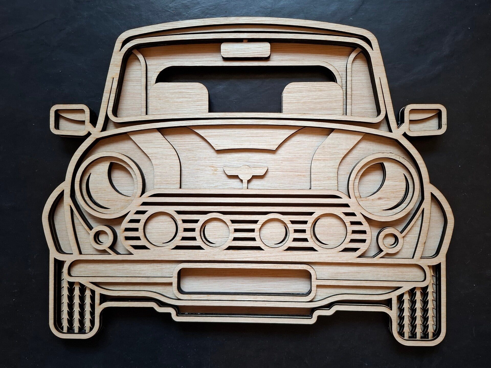 Deze Mini Cooper is een opvallende verschijning aan je muur.